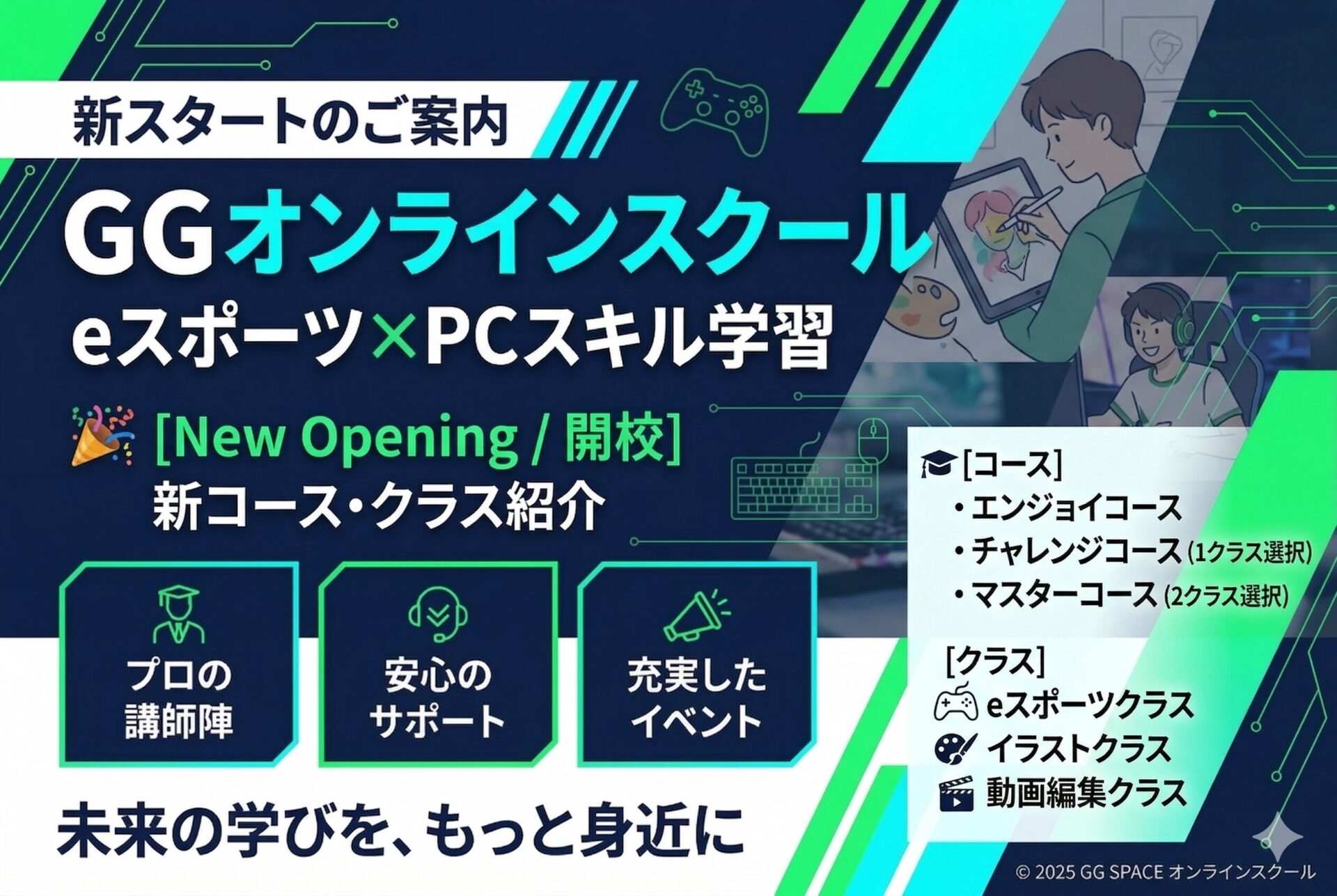 eスポーツを通じて基礎的なパソコンスキルから競技レベルまで、仲間とともに自ら「学んで」「成長できる」次世代の教育・育成スクール「GGSPACE」が2022年10月より開校しました。